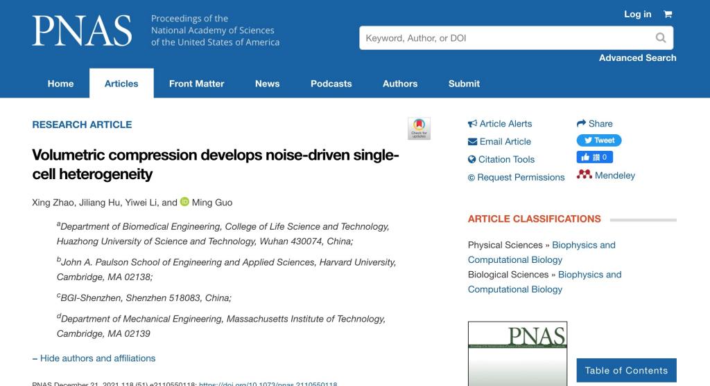 On December the 16th, Professor Yiwei Li from the College of Life Science of Technology of Huazhong Unviersity of Science and Technology, together with Prof. Ming Guo from the department of mechanical engineering MIT publish a research paper entitled “Volumetric compression develops noise-driven single cell heterogeneity” in on the journal PNAS.