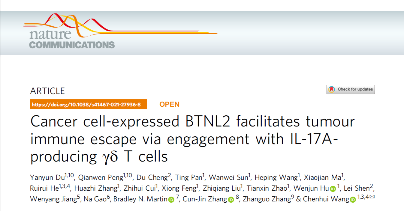 The team of Professor Chenhui Wang from the School of Life Science and Technology of Huazhong University of Science and Technology published the title "Cancer cell-expressed BTNL2 facilitates tumor immune escape via engagement with IL-17A producing γδ T cells" in the international authoritative journal "Nature Communications" latest research results.