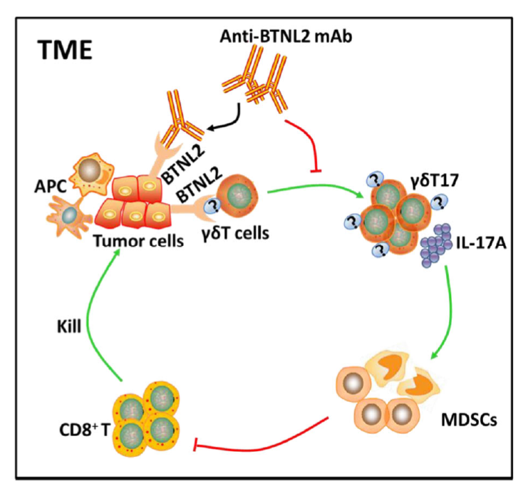 Through research, we found that BTNL2 inhibits antitumour immunity by acting on the γδ T cell population in the tumor microenvironment to promote IL-17A production which enhances tumour immune resistance via recruitment of MDSCs,then reduction of cytotoxic CD8+ T cell infiltration. Blockage of BTNL2 with a novel monoclonal neutralizing antibody has a significant therapeutic effect for multiple mice tumours, and has a synergistic effect with anti-PD-1 blockage. Our further study found that BTNL2 expression in human tumors was highly correlated with patient prognosis as well as γδT17 infiltration. Patients with lung adenocarcinoma and colon adenocarcinoma that expressed low levels of BTNL2 had significantly improved survival compared to those expressing high levels of BTNL2. In lung adenocarcinoma samples, BTNL2 was mainly expressed by cancer cells. Importantly, protein levels of BTNL2 were much higher in almost all of the examined cancer samples when compared to matched para-cancerous tissue. BTNL2 is not only an attractive target candidate for cancer immunotherapy but also may have utility as a biomarker for lung adenocarcinoma. In summary, we report that BTNL2 is a promising cancer immunotherapeutic target, with potential to enhance the efficacy of currently available immunotherapies, and possibly also to offer alternative standalone therapy in patients who are resistant to the current cancer immunotherapy.