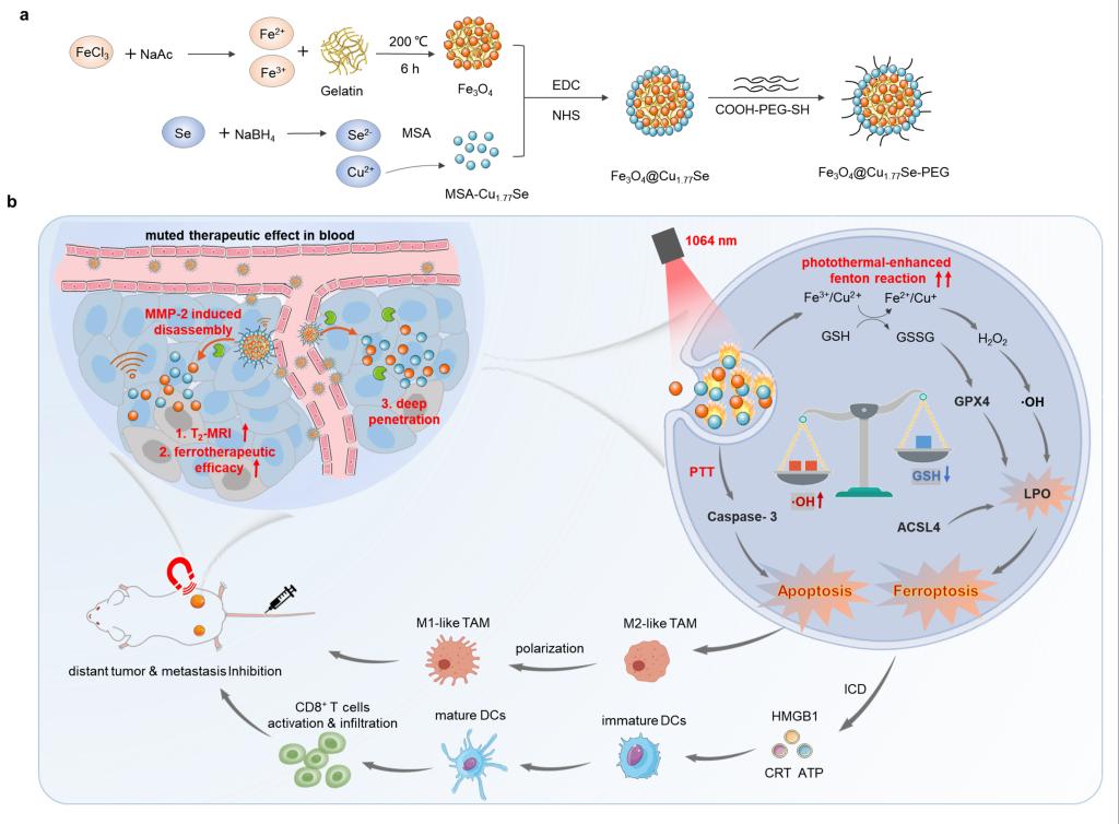 铁死亡(Ferroptosis)是一种铁依赖型细胞程序性死亡方式。铁死亡的主要机制是在二价铁或酯氧合酶的作用下,产生过量的羟基自由基(·OH),催化细胞膜上高表达的不饱和脂肪酸,发生脂质过氧化,从而诱导细胞铁死亡;其还表现为谷胱甘肽的耗竭,谷胱甘肽过氧化物酶(GPX4)活性下降。开发高效的铁死亡诱导药物是抗肿瘤治疗的有效方式之一。然而,目前铁死亡诱导药物存在系统给药后药物全身分布毒性大、肿瘤细胞杀伤效果有限等不足。针对上述问题,研究团队选择以明胶为模板、通过金属配位作用制备Fe3O4纳米簇,联合缺陷型Cu1.77Se,开发了金属基蛋白酶激活的Fe3O4@Cu1.77Se纳米酶。