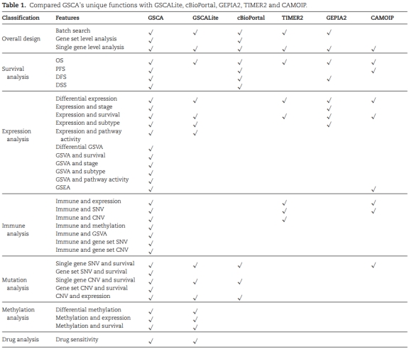 癌症的发生发展通常是一组基因或者通路异常导致的,单个基因的异常信号可能会在背景噪声中淹没。针对基因集的整体分析可以提高信噪比,在基因集水平识别潜在的生物学信号。然而,目前缺乏使用基因集分析方法探索癌症多组学数据的平台。因此本研究将GSCALite升级为GSCA(http://bioinfo.life.hust.edu.cn/GSCA),其整合了33种癌症的基因组、药物基因组和免疫基因组数据。与GSCALite相比, GSCA着重体现基因集整体分析的思想,主要更新了以下三个特性: 1)基因集的整合表达水平(GSVA评分)与临床结局(生存和疾病TNM分期)的关联性分析;2)基因集的整合突变情况与4种生存时间的关联分析;3) 基因集的整合表达水平和整合突变情况与免疫细胞丰度的关联分析。下表通过与GSCALite及其他癌症多组学分析平台进行比较,展示GSCA的独特特征。