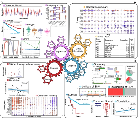 作者基于TCGA的癌症多组学数据、免疫丰度数据和小分子药物敏感性数据等,开发生物信息计算方法,构建癌症基因集分析平台GSCA。用户通过输入基因集或者通路中的基因名,选取分析类型和癌症类型,提交后即可获得能够用于发表的精美图片结果。GSCA是第一个利用基因集分析进行癌症多组学和免疫丰度分析及可视化的网页数据库平台。GSCA(http://bioinfo.life.hust.edu.cn/GSCA/)主要的功能模块包括:①基因表达与临床结果关联;②免疫细胞丰度与基因组特征关联分析;③基因突变与临床结果关联分析;④基因的药物敏感性分析。作者经过示例分析发现,利用GSCA的基因集分析方法,可以发现在单基因水平无法发现的临床新关联。