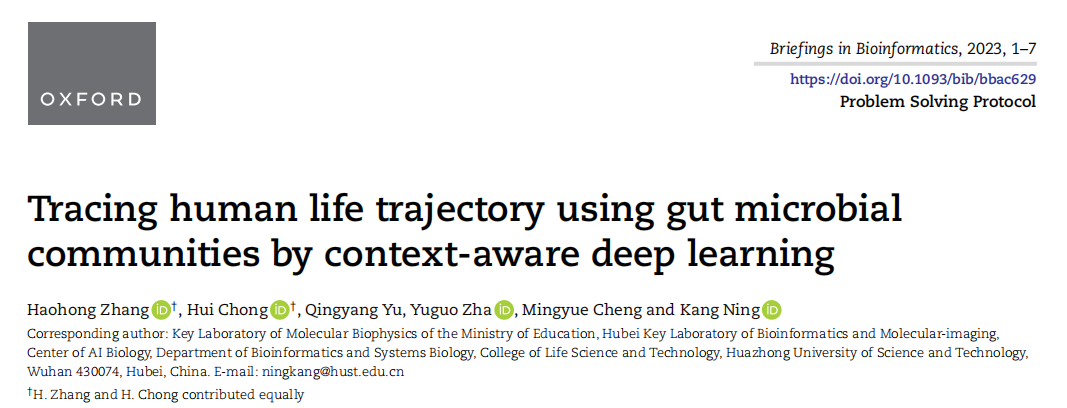 Haohong Zhang, Hui Chong, Qingyang Yu, Yuguo Zha, Mingyue Cheng, Kang Ning*. Tracing human life trajectory using gut microbial communities by context-aware deep learning. Briefings in Bioinformatics, 2023, bbac629.