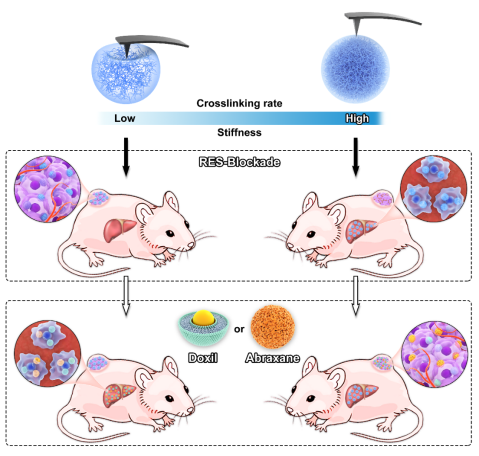 纳米药物已经广泛应用于肿瘤临床治疗,但是网状内皮系统的快速清除严重限制了其治疗效果。网状内皮系统阻塞(RES-blockade)策略可以暂时性地、可逆地延缓肝脏清除,提高纳米药物的肿瘤富集以及抗肿瘤作用,具有良好的生物安全性。然而,循环系统中大量的纳米颗粒仍然会对网状内皮系统带来额外的负担,因此提高RES-blockade策略效率尤为重要。研究表明,RES-blockade策略的效率受到多种因素的影响,包括阻塞与给药的时间间隔、阻塞剂量以及阻塞材料的理化性质等。纳米颗粒的力学性能显著影响纳米药物体内递送的五个关键过程,包括血液循环、肿瘤富集、深部穿透、细胞摄取以及药物释放,然而对RES-blockade策略效率以及巨噬细胞功能的影响尚不清楚。