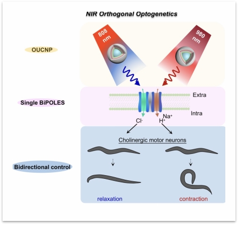 图1. 正交近红外光遗传技术 单个正交上转换纳米粒(OUNCP)受不同波长NIR(808nm & 980nm)激发后发射不同的蓝色和红色可见光,通过特异激活表达在秀丽线虫乙酰胆碱能运动神经元上的光敏感蛋白BiPOLES,双向调控线虫神经元活性和运动行为。