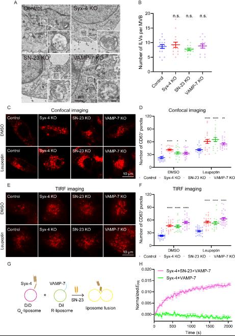 接下来,本研究综合透射电镜、荧光成像、脂质体融合等多项技术手段,从细胞和分子水平确定Syntaxin-4, SNAP-23和VAMP-7均不参与MVB形成和转运等分泌前期步骤,其组成的SNARE复合体特异性驱动MVB与PM融合,完成外泌体分泌的最后步骤(图2)。同时,本研究在人宫颈癌和黑色素瘤细胞内验证了Syntaxin-4, SNAP-23和VAMP-7在外泌体分泌功能中的保守性。