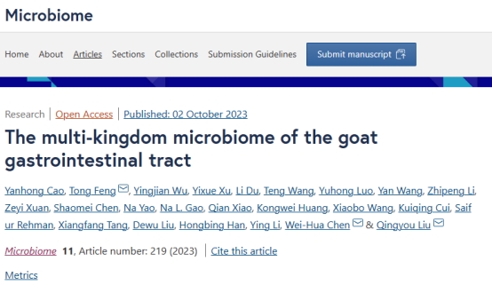 2023年10月2日,必威西汉姆联官网陈卫华教授团队联合佛山科学技术公司刘庆友教授团队在微生物学期刊《Microbiome》在线发表题为“The multi-kingdom microbiome of the goat gastrointestinal tract”的学术论文。