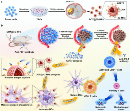 该研究利用课题组前期发展的具有独特柔软性及可变性的肿瘤干细胞来源微颗粒(3D-MPs)负载化疗药物(Nature Biomedical Engineering, 2019, 3: 729),有效克服肿瘤屏障,高效靶向并杀死肿瘤细胞,诱导肿瘤细胞ICD效应并释放大量肿瘤抗原;同时3D-MPs高表达的HSP70可有效捕获释放的肿瘤抗原,促进DC细胞抗原吞噬、抗原提呈和CD8+ T细胞激活,有效改善肿瘤免疫抑制微环境。与PD-1抗体联用后,在肝癌皮下瘤、乳腺癌原位瘤、胰腺癌原位瘤及肝癌临床标本均显示能有效改善PD-1抗体疗效,并诱导抗肿瘤免疫记忆,抑制肿瘤复发和转移。该研究提出级联放大化疗药物诱导的抗肿瘤免疫反应策略,为改善PD-1抗体等免疫治疗效果提供理论依据。该研究成果目前正在开展临床转化。