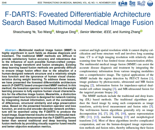 2023年10月27日,公司必威西汉姆联官网丁明跃教授和张旭明副教授在国际著名期刊《IEEE Transactions on Medical Imaging》上发表了题为 “F-DARTS: Foveated Differentiable Architecture Search Based Multimodal Medical Image Fusion”的研究论文。