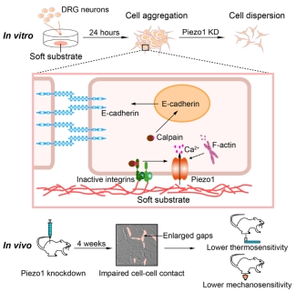该研究进一步对Piezo1介导的基底硬度依赖性DRG神经元聚集的机制进行了探究,解析出基底硬度通过调控Piezo1–calpain–integrin-β1/E-cadherin信号通路控制细胞与细胞以及细胞与基质间的黏附,从而影响DRG神经元聚集以及大鼠感知功能(如图3)。