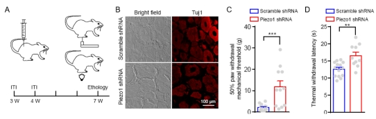 该研究还在体内探究Piezo1对DRG形态和功能的影响。免疫组化实验发现,敲低Piezo1导致大鼠DRG中神经元之间的间隙增大,说明Piezo1调控DRG形态(如图2B)。躯体感知行为学实验发现,Piezo1敲低大鼠的热感知和机械力感知能力减弱(如图2C和2D)。由于Piezo1通道本身并不是热敏感通道,因此,该研究认为大鼠躯体感知能力的变化来源于DRG形态学的变化。综合体内外实验结果,该研究证明了Piezo1能够通过调控DRG神经元聚集来介导其形态发育,最终影响DRG感知功能。