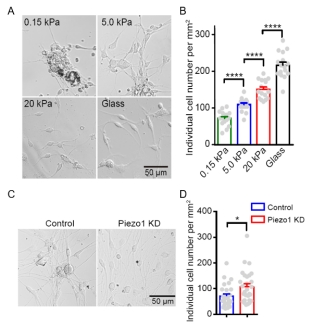 该研究将DRG神经元培养在具有不同硬度的聚丙烯酰胺(polyacrylamide,PA)凝胶上,发现DRG神经元的聚集程度受基底硬度介导的力学信号影响,DRG神经元聚集程度随着基底硬度的增加而降低(如图1A和1B)。通过抑制剂筛选和shRNA敲低实验,发现钙离子通透的机械敏感阳离子通道Piezo1在基底硬度介导的DRG神经元聚集过程中发挥着重要功能(如图1C和1D)。