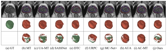 图2 不同SSL方法在3D前列腺MR图像上的分割结果(仅使用10%带标签数据)
