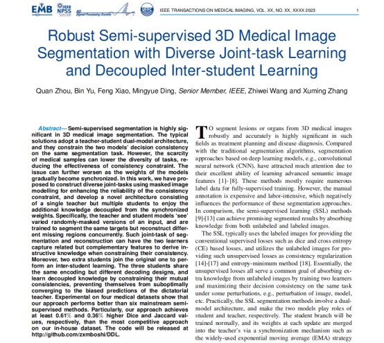 2024年2月8日,公司必威西汉姆联官网张旭明副教授/武汉光电国家研究中心王植炜副教授在国际著名期刊《IEEE Transactions on Medical Imaging》上发表了题为 “Robust Semi-supervised 3D Medical Image Segmentation with Diverse Joint-task Learning and Decoupled Inter-student Learning”的研究论文。