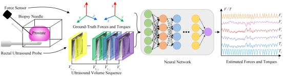 目前,穿刺手术机器人普遍存在的问题是缺乏手术器械-软组织相互作用力的精确感知能力,这严重影响穿刺手术的安全性。解决该问题的传统途径是采用力传感器进行直接力感知,但其存在精度低或成本高、尺寸限制和生物兼容性等问题。基于视觉的力感知方法(Vision-based Force Sensing, VFS)是近年来流行的新方法,但现有方法主要基于光学成像设备获取的软组织浅层图像,借助卷积神经网络(Convolutional Neural Network, CNN)和循环神经网络(Recurrent Neural Network, RNN)等模型学习图像中的形变,从而间接实现力感知。由于软组织浅层形变难以有效反映穿刺力大小,同时CNN和RNN等模型缺乏长距离相关性捕获能力,导致现有方法难以实现穿刺力精确感知。