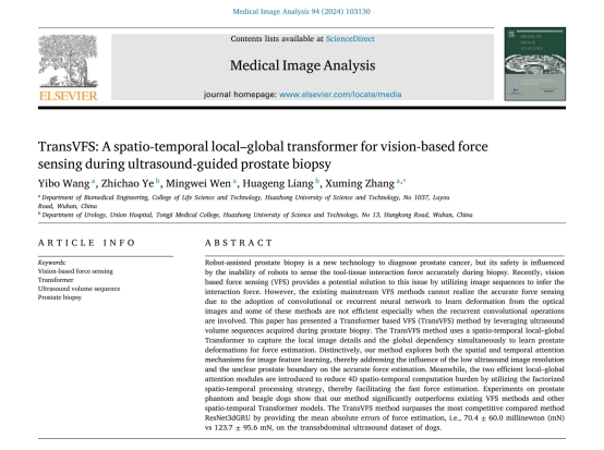 2024年3月2日,公司必威西汉姆联官网张旭明副教授在国际著名期刊《Medical Image Analysis》上发表了题为“TransVFS: A spatio-temporal local-global transformer for vision-based force sensing during ultrasound-guided prostate biopsy”的研究论文。