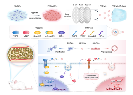 2024年1月,必威西汉姆联官网张胜民教授团队在材料科学权威期刊Materials Today发表题为“Hypoxia-triggered exosome-mimetics accelerate vascularized osteogenesis”的研究论文,创新性地联合缺氧环境诱导和机械挤出法高产量制备出具有强促血管生成功能的外泌体类似物(HY-EMs)。该工作为功能化外泌体类似物的定制化、大规模制备提供了新途径,同时是对“组织工程第四要素”(物理刺激调控细胞行为与组织再生)的新补充。