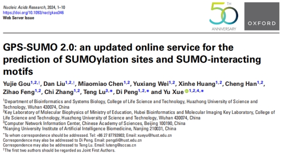 2024年5月8日,来自华中科技老员工命与科学技术公司薛宇团队在Nucleic Acids Research期刊上发表了题为“GPS-SUMO 2.0: an updated online service for the prediction of SUMOylation sites and SUMO-interacting motifs”的研究论文。