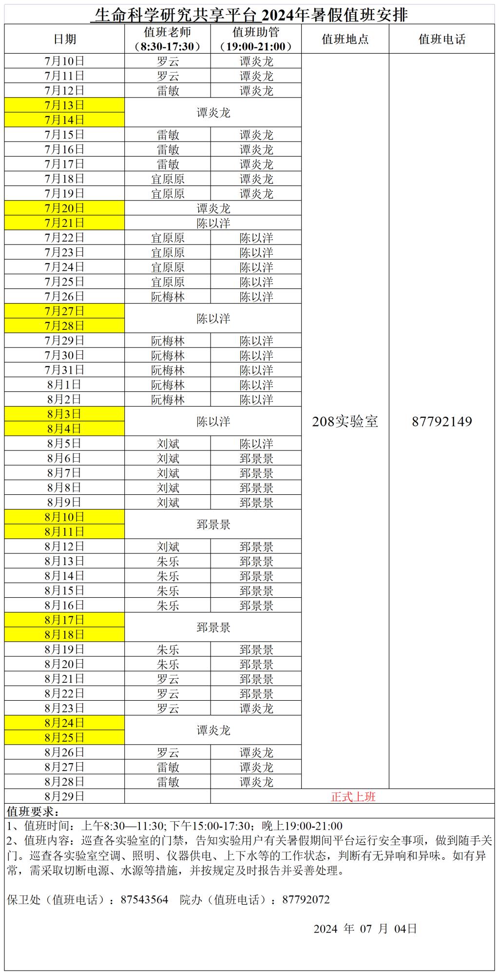 2、值班内容:巡查各实验室的门禁,告知实验用户有关暑假期间平台运行安全事项,做到随手关门 。巡查各实验室空调、照明、仪器供电、上下水等的工作状态,判断有无异响和异味。如有异常,需采取切断电源、水源等措施,并按规定及时报告并妥善处理。